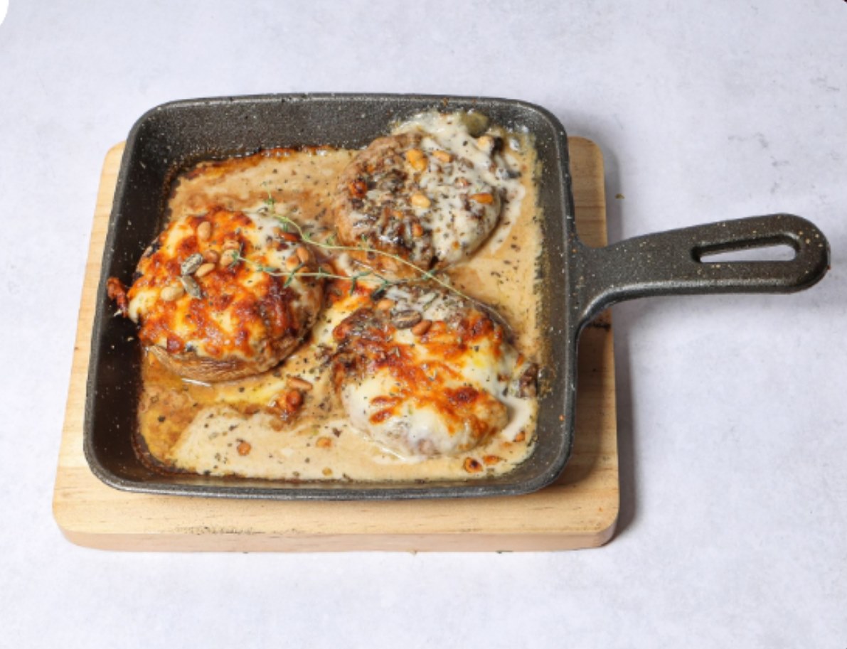 فطر مشوي بالفرن مع بصل مكرمل، صلصة شميت وميكس أجبان